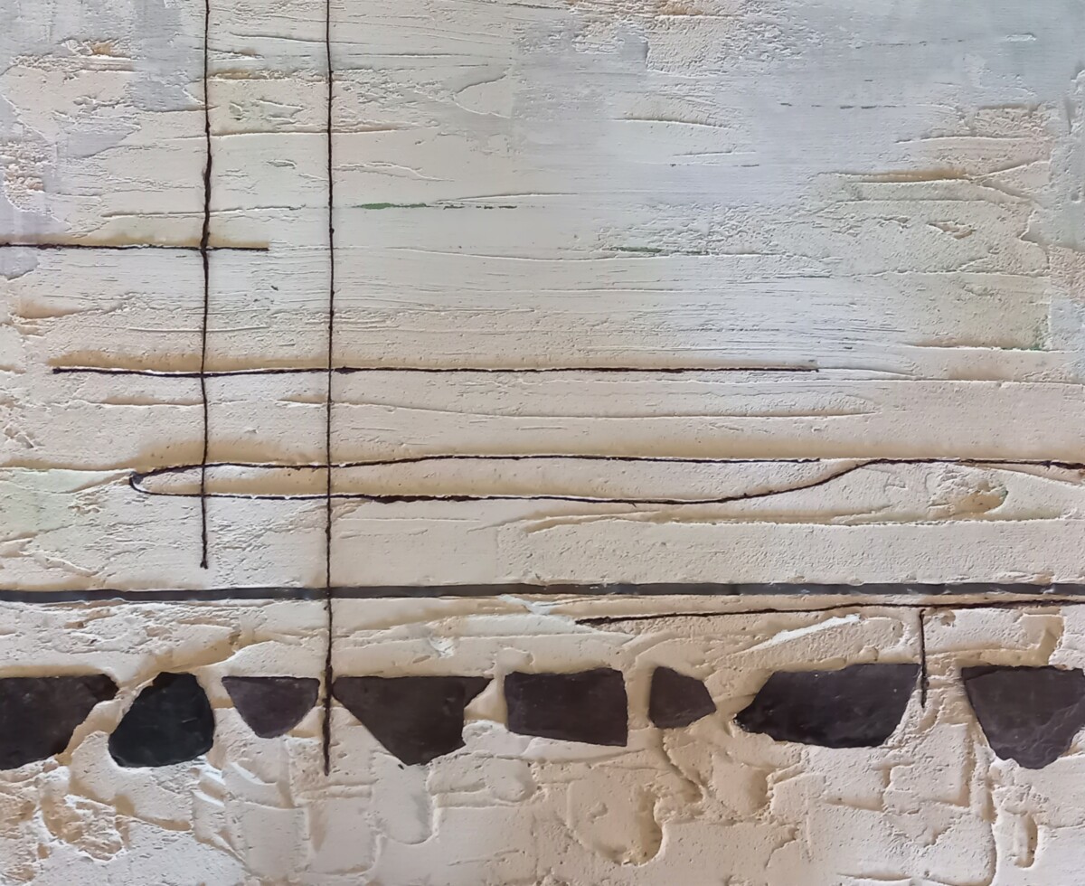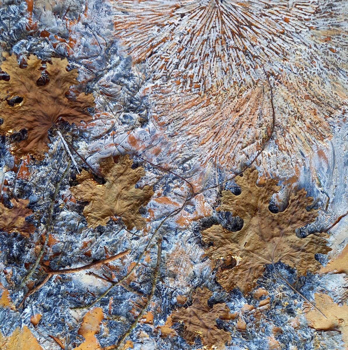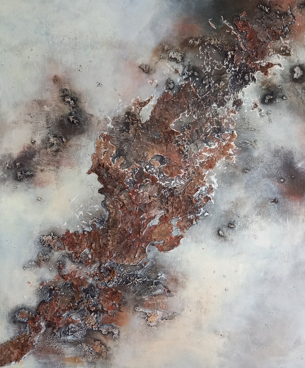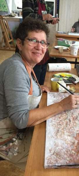 Ze werkt het liefst met acrylverf en vermengd dit soms met materialen als zand, pasta, draad, papier of andere materialen.